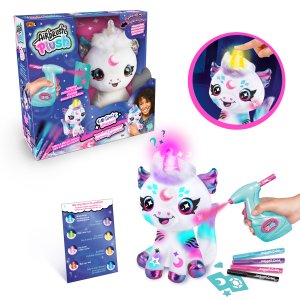 Navrhni a vybarvi si svého vesmírného jednorožce Plyšové zvířátko si můžeš pomocí airbrush libovolně posprejovat, můžeš využít různé barvy a šablony Pokud se ti vytvořený design přestane líbit, stačí plyšáka omýt vodou a můžeš začít znovu Plyšákovi svítí kouzelný roh a může odpovědět díky barvě rohu na otázku ano-ne
