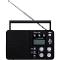 FM rádio 87,5 - 108 MHz AM rádio 522 - 1620 kHz SW Rádio 3,7 -22,05 MHz Teleskopická anténa Vstup AUX-IN Reproduktor 1x 3,5" Výkon 1W RMS Funkce snooze, spánku LED displej Napájení síť / baterie - DC6V / (4 x D baterie nejsou součástí balení) Doba přehrávání na baterie při střední hlasitosti cca 300 hodin Paměť přednastavených stanic pro 3 kanály