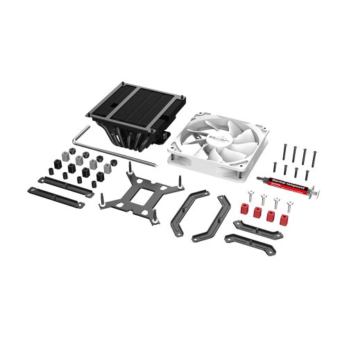 TDP: 165W Počet ventilátorů: 1 (120x120x25mm) Rychlost ventilátoru: 600-1900 ot./min Maximální průtok vzduchu: 83,63CFM Maximální tlak vzduchu: 2,98mm-H20 Hlučnost: 6,9–28,9dB(A) Jmenovité napětí ventilátoru: DC 12V Konektor ventilátoru: 4pinový PWM Materiál: hliníková žebra s měděnými trubicemi Rozměry chladiče: 120x120x76mm Hmotnost: 550g Kompatibilita: