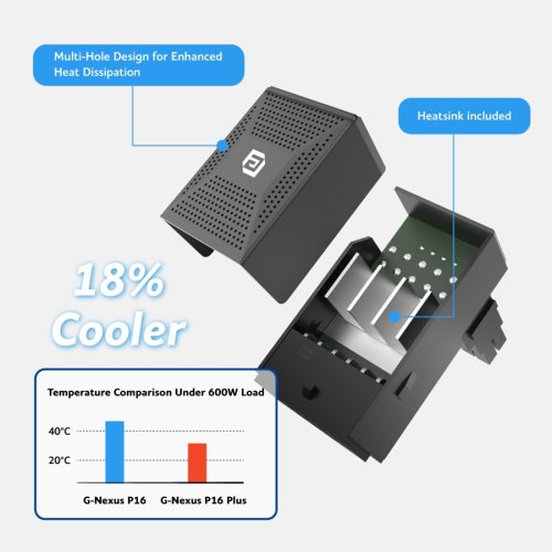 Kompaktní hliníkové pouzdro nejen šetří místo pro snadnější vedení kabelů, ale nabízí i lepší odolnost a zvýšený odvod tepla o 18 %. Inovativní konektor 12V-2X6, který umožňuje snadno vylepšit estetický vzhled a správu kabelů pomocí adaptéru 12+4-pin s 90stupňovým připojením. Podporuje až 600 W výstupního výkonu a zajišťuje stabilní a spolehlivou dodávku energie. Ideální pro moderní grafické karty NVIDIA RTX a ATX 3.1 PSU s 16pinovým konektorem. Adaptér 12V-2X6 je zpětně kompatibilní s 12VHPWR.