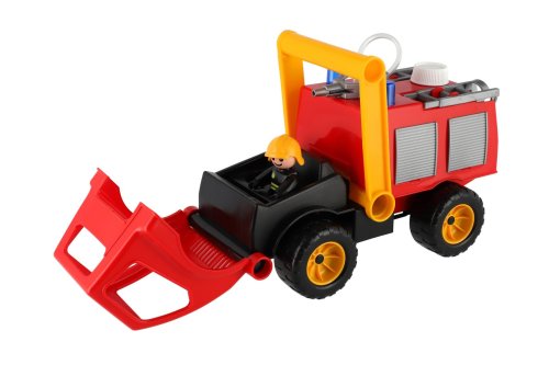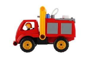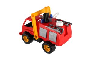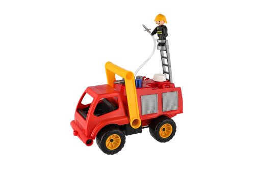 Aktivní hasič z kvalitního plastu a velmi pevnou stavbou. Je plně mechanicky funkční. Osahuje nádobku na vodu s mechanickou pumpou k vodnímu dělu a odklopitelnou kabinu s panáčkem. Délka cca 30 cm. Vhodné pro kluky od 3 let.