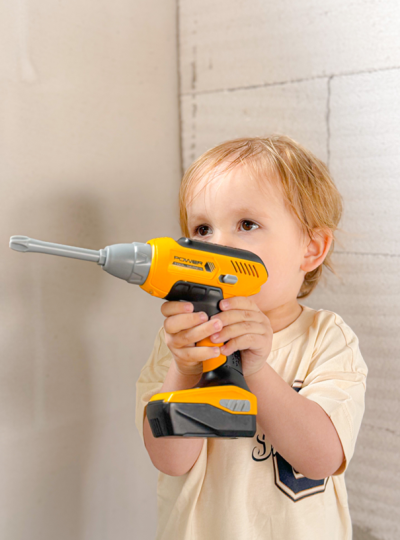 Aku vrtačka, která vydává zvuk vrtání a svítí. Součástí jsou 4 různé nástavce pro vrtání. Vrtačka rozvíjí dětem motoriku a učí děti manuální práci.