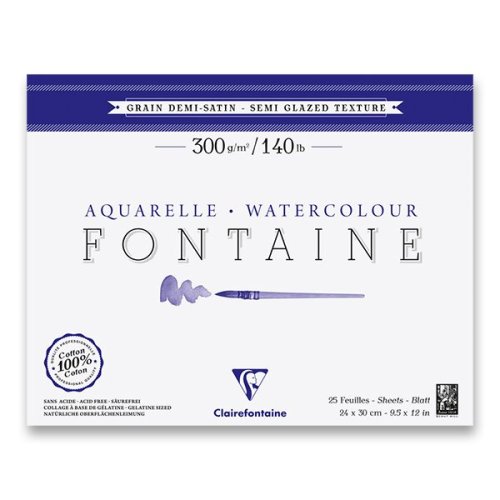 Akvarelový blok Clairefontaine Fontaine Semi Glazed s rozměry 24 x 30 cm má 100% bavlněný papír, který má téměř hladký povrch, který neklouže.