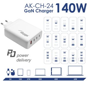Akyga Nabíječka univerzální USB-A + 3x USB-C PD 5-28V / max. 5A 140W Quick Charge 3.0 GaN, bílá
