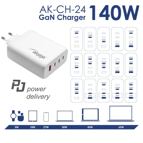 Nabíječka Akyga® AK-CH-24 USB-C je pokročilé zařízení, které nabízí maximální výkon 140 W a poskytuje rychlé a efektivní nabíjení i pro ta nejnáročnější zařízení.
