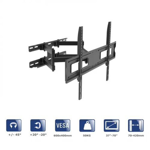 S jeho pomocí je možné zavěsit jak malé televizory s úhlopříčkou 37 palců, tak velké televizory s úhlopříčkou až 70 palců.