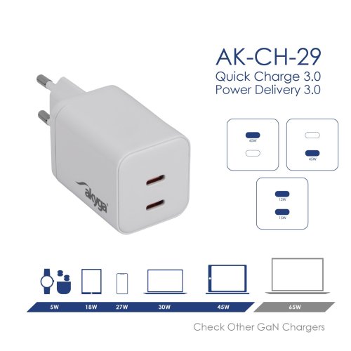 Akyga® AK-CH-29 je moderní síťová nabíječka s dvěma porty USB-C, navržená pro uživatele, kteří potřebují rychlé, bezpečné a současné nabíjení více zařízení. Každý port podporuje výkon až 45 W a technologie Power Delivery (PD) a PPS umožňují inteligentní přizpůsobení napájení konkrétnímu zařízení.