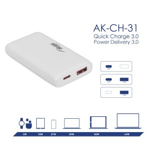Akyga® AK-CH-31 je výkonná USB nabíječka s technologií GaN, která nabízí dva výstupy – USB-C a USB-A. S maximálním výkonem 65 W je ideální pro nabíjení smartphonů, tabletů, notebooků i dalších zařízení. Podporuje nejnovější standardy rychlého nabíjení včetně Quick Charge 4+, Power Delivery 3.0 a PPS.