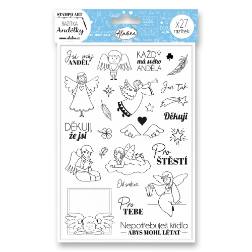 Gumová razítka na pěnové hmotě s motivy andílků a českými texty. Razítka jsou ideální na výrobu přáníček, děkovných kartiček, obalů na dárky, dárkových tašek, záložek a výrobu originálních malých dárků. Razítkovací štoček má hluboký reliéf, razítka tak vynikají na papíře, na textilu (doporučujeme použít razítkovací pošltářek na textil), ale i v hmotách: keramika, samotvrdnoucí hmoty, slané těsto nebo polymerové hmoty. Sada obsahuje 27 ks razítek. Velikost archu s razítky je 13 x 19 cm.