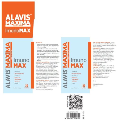 Imunoglobuliny - bílkoviny produkované imunitním systémem, které hrají klíčovou roli v obranyschopnosti organismu. K tomu, aby se tělo ubránilo virům a bakteriím potřebuje imunoglobuliny. ALAVIS™ MAXIMA ImunoMAX jich obsahuje 30 %.vitamin C v biologicky dostupné formě NUTRA-C™, který přispívá k normálnímu energetickému metabolismu a snížení míry únavy a vyčerpání a k dobré funkci imunitního systému.kvasnice obohacené selenem, který chrání buňky před oxidativním stresem a podporuje imunitní systém.