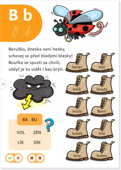 Jednotlivým samohláskám a souhláskám je věnován vždy ucelený blok zábavných úkolů, které podporují procvičení i upevnění výuky čtení.