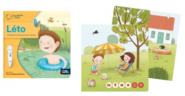 UPOZORNĚNÍ: Kniha Jaro funguje pouze s elektronickou tužkou ALBI (není součástí balení). Minikniha Léto z edice Kouzelné čtení je určena nejmenším dětem. Seznámí je s naším nejteplejším ročním obdobím. Kniha dětem od 2 let ukáže, čím vším se mohou přes prázdniny bavit. Přišel čas léta a s ním jsou tu i prázdniny. Kde je asi stráví Madlenka s Jonášem? Sedět doma určitě nebudou. Půjdou se vykoupat k rybníku nebo sjedou řeku na kánoi. Pojďte zjistit, co se jim přihodí při přípravě táboráku. Znovu se setkáte s pejskem Blekem i kočku Mícou. A nebude chybět ani letní písnička . Knížka obsahuje přes 350 zvukových stop . Namluvili Tereza a Matouš Rumlovi. Vhodné pro děti od 2 let. NECHTE KNIHY MLUVIT! Kouzelné čtení je unikátní výukový systém, který vám přináší spoustu informací a zábavy. Stačí, když se lehce dotknete elektronickou tužkou obrázku nebo textu, ozve se příslušná informace, zvuk nebo hudba. Kouzelné čtení je určeno dětem v předškolním věku, tak dětem starším, ale bezpochyby zaujme i dospělé. Díky speciální technologii mohou knihy plně využívat i děti v předškolním věku, které ještě číst neumí. Samy si tak mohou „přečíst“ pohádku nebo se hravou formou naučit poznávat barvy, čísla, písmena či nejrůznější tvary. Výhody Kouzelného čtení ALBI: