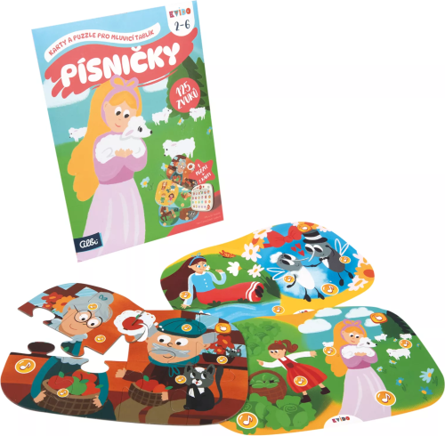 V sadě naleznete 1 oboustranné puzzle a 2 oboustranné obrázkové karty – obojí s ozvučenými obrázky, zvuky a kvízy. Audio je již nahrané v základní sadě Mluvicího tablíku, takže není potřeba si soubory stahovat. Složené puzzle či kartu stačí pouze položit přes ikony do tablíku. Aktivity s Mluvicím tablíkem podporují rozvoj smyslového vnímání, poznávání, paměti a jemné motoriky. Děti si zazpívají těchto 10 českých písniček - Já jsem muzikant, Měla babka čtyři jabka, Pásla ovečky, Šla Nanynka do zelí, Travička zelená, Hlava, ramena, kolena..., Holka modrooká, Komáři se ženili, Kočka leze dírou a Prší, prší.
