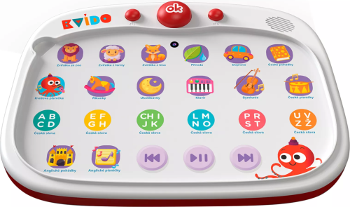 Dotykový tablík se zvuky a kvízy. Tablík, který je v českém jazyce, je doplněn o pohádky a písničky v angličtině.