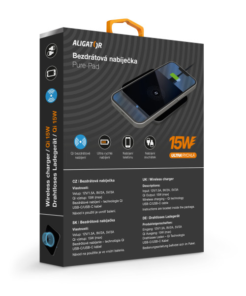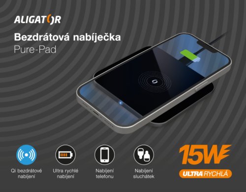 Rychlé nabíjení bez kabelu Výkonný a praktický Aligator Pure-Pad si hravě poradí s rychlým bezdrátovým nabíjením díky cívce s výkonem 15W, která dokáže doplnit energii v co nejkratším čase. Užívejte si rychlé nabíjení pohodlně a bez kabelu!