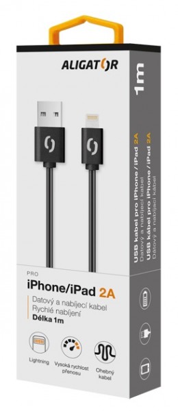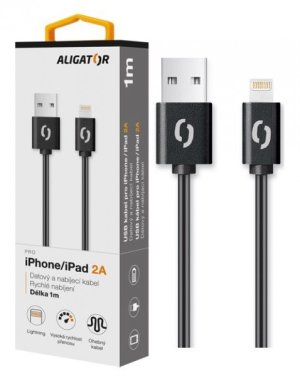 Datový a nabíjecí pro iPhone/iPad s lightning konektorem ALIGATOR: *Vysoce kvalitní konektory *Vysoká rychlost přenosu dat *Možnost rychlého nabíjení 2A *Délka: 1m *Barva: černá