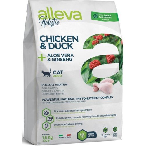 Představujeme vám nejpokročilejší bezobilný produkt na trhu – granule, při jejichž přípravě jsou veškeré ingredience vařeny šetrně v páře, aby si uchovaly vysokou nutriční hodnotu. To platí zejména pro prvotřídní maso, čerstvé i dehydrované, které je hlavní složkou hojně obsaženou ve všech recepturách. Aby krmiva této řady plnila své poslání, jímž je celostní podpora tělesného i duševního zdraví vaší kočky, obsahuje každé z nich bohatý koktejl přírodních fytonutrientů, které zpomalují buněčné stárnutí, posilují imunitní systém a kondici kůže a zvyšují celkovou vitalitu zvířete. V neposlední řadě jsou krmiva doplněná živinami podporujícími správné „spalování“ tuků a funkce srdce, kloubů a trávicí soustavy. Chcete-li své kočce dopřát jen to nejlepší a její zdraví a spokojenost jsou pro vás na prvním místě, krmiva Alleva Holistic vaše požadavky beze zbytku naplní!