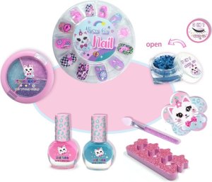 V balení najdete třpytky na tělo a obličej, nalepovací barevné nehty, oční stíny, pilníček na nehty, 2 laky na nehty, odělovač prstů pro lakování nehtů.