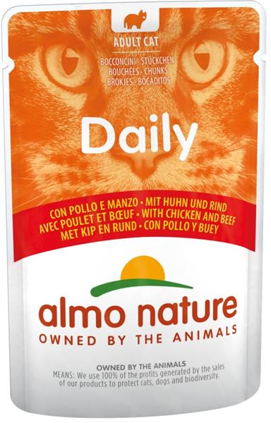Kapsičky Almo Nature Daily Menu ve stravitelných masových a rybích variantách jsou obzvláště chutné a zároveň snadno stravitelné. Pro toto šťavnaté kompletní krmivo jsou vybrány vysoce kvalitní suroviny, které jsou vařeny ve vývaru, aby si zachovaly přirozenou chuť a cenné složky. Díky tomu vaše kočka získá základní živiny, jako jsou bílkoviny, vitamíny a minerály. Tato prémiová značka krmiva pro domácí zvířata se důsledně vyhýbá chemickým přísadám, jako jsou barviva a konzervační látky. Díky vysokému obsahu vlhkosti v krmivu je organismus vaší kočky zásobován dostatečným množstvím tekutin. Praktické kapsičky zaručují maximální čerstvost a chuť a zároveň usnadňují čisté a snadné porcování. Složení: maso a vedlejší produkty živočišného původu (kuře 4 %, hovězí 4 %), vedlejší produkty rostlinného původu, rostlinný protein, minerály. Analytické složky: hrubý protein 9 %, hrubá vláknina 0,8 %, hrubé oleje a tuky 5 %, hrubý popel 2,5 %, vlhkost 82 %. Krmný návod: Pro 4 kg kočku 110 g vlhkého krmiva a 35 g suchého krmiva denně.