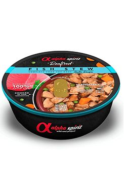 Dušené pomalým vařením 100% čerstvé maso tuňáka v omáčce s mrkví, hráškem a dýní, vařené při nízkých teplotách, vakuované do znovu použitelné misky.