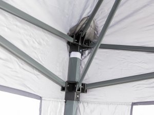 Skládací altán SULTAN o rozměru 3 x 3 m a výškou 2,5 m se stabilní nosnou konstrukcí nohy 30 x 30 / 25 x 25 mm a skládacím nůžkovým mechanismem žeber 10 x 18 mm. Střešní potah 210D Oxford je opatřen vnitřní stříbrnou vrstvou a dvojitým nástřikem pro zvýšení odolnosti proti povětrnostním vlivům.