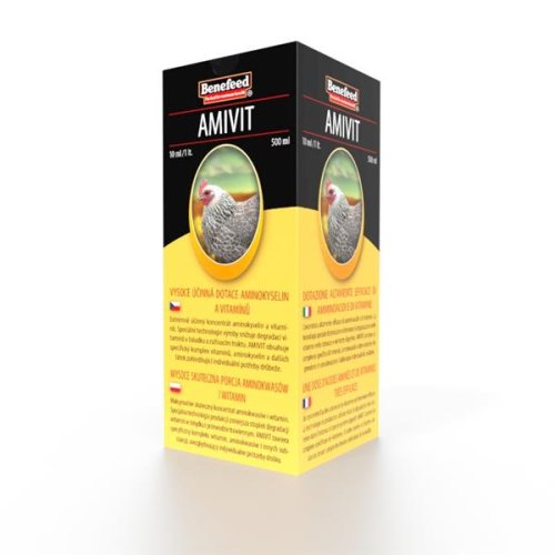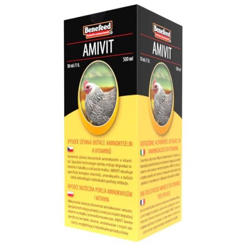 Vysoce účinná dotace aminokyselin a vitamínů. AMIVIT se používá zejména v situacích jako je stresový stav, při zdravotních problémech a jejich prevenci, při nebezpečí infekce, při nedostatku vitamínů nebo aminokyselin v zimě, nesprávné výživě apod. Přípravek podporuje rychlou regeneraci organismu po onemocněních, doporučuje se také podávat v období březosti a mláďatům v době růstu. Složení: vitamíny, aminokyseliny, přírodní látky, upravená pitná voda Podání a dávkování: Podává se v množství 10 ml na 1 litr napájecí vody po celý rok.