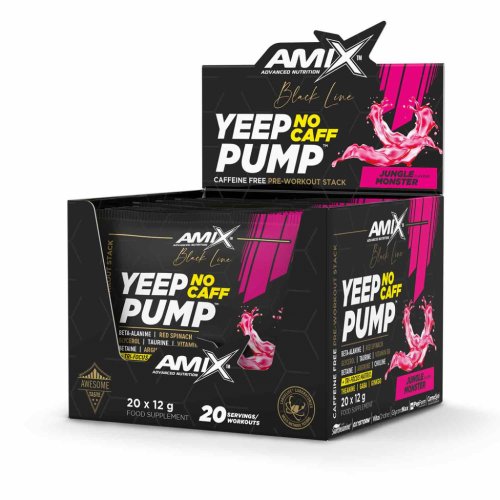Yeep Pump je revoluční super koncentrovaný předtréninkový produkt určený pro nejnáročnější sportovce, kteří chtějí posunout své tréninky na další level. PREWORKOUT BEZ KOFEINU! Tento osvěžující a chutný nápoj je založen na dávce 3 g CarnoSyn® Beta-alaninu a obohacen o Arginin Matrix, Tri-Focus Matrix, Taurin, L-lysin, glycerin GlyceroMax™, VitaCholine®, extrakt z červeného špenátu Oxystorm® a Betain. Vitamin B6 přispívá ke snížení únavy a vyčerpání. Ginkgo Biloba je silný antioxidant a podporuje mikrocirkulaci krevního systému. Doporučené dávkování: