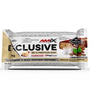 Exclusive bar je proteinová tyčinka s minimálním obsahem bílkovin 25 %. Dovolujeme si Vám představit absolutní novinku v oblasti proteinových tyčinek na našem trhu. Exclusive Protein Bar jako jediná v ČR obsahuje nejkvalitnější patentované zdroje bílkovin - MilkPro® Protein Blend. Při výrobě našich produktů pečlivě dbáme na použití těch nejkvalitnějších značkových surovin. Ani u Exclusive Protein Bar tomu není jinak. Jako zdroj bílkovin jsme použili MilkPro® Protein Blend, která obsahuje pouze patentované suroviny CFM® syrovátkový bílkovinný izolát a koncentrát, částečně hydrolyzovaný syrovátkový izolát HydroVon®. Dále jsme přidali hydrolyzované peptidy (L-glutamin PepForm®, BCAA PepForm®). Benefity: