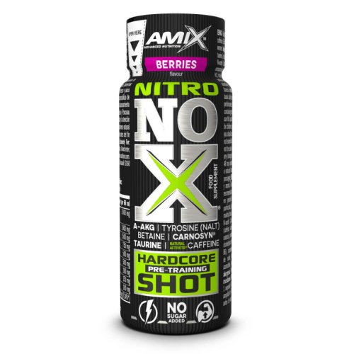 ! Obsahuje kofein, není vhodné pro děti a těhotné ženy. Denní dávka (1 ampule/60 ml) obsahuje 200 mg kofeinu. Produkt není vhodný pro osoby trpící přecitlivělostí na kofein. NitroNoX® Shot je revoluční předtréninkový produkt ve výborně vstřebatelné tekuté formě, připravený v praktické „Single Shot“ ampuli kapesní velikosti. S NitroNoX® Shot dáte vašim tréninkům zcela nový rozměr. Nyní v novém balení s novou chutí i inovovaným složením. NitroNoX® Shot obsahuje Arginin AKG, CarnoSyn® - Beta alanine, enkapsulovaný Caffein, Tyrosin (NALT), Taurin, L-Citrullin, Betain, Glucuronolacton, Histidin a Vitamin B6. Doporučené dávkování: