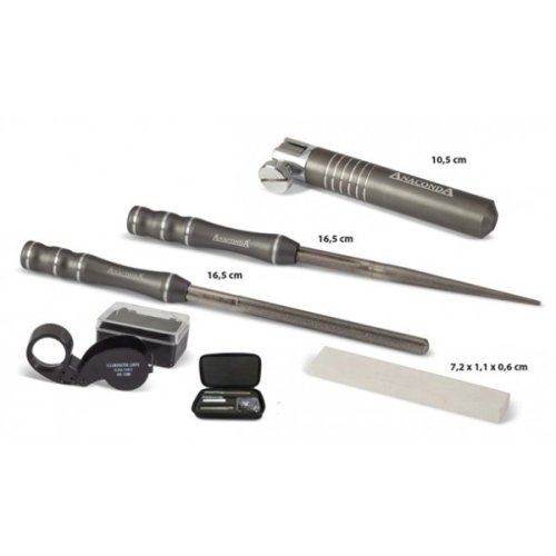 Profesionální set na broušení háčků. Držák háčků je navržen tak, aby bylo možné brousit háčky všech velikostí. Sada obsahuje držák háčků, kónický brousek, kulatý brousek, brusný kámen a praktickou lupu s LED osvětlením, vše v praktickém pouzdře.