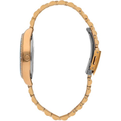 Dámské náramkové hodinky Napájení z baterie Pouzdro ve tvaru kruhu Kovové pouzdro Zlatavá barva pouzdra Kovový tah Zlatavá barva tahu Ručičkový ciferník Materiál skla - minerální sklo Odolné proti vodě při běžném nošení