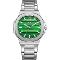 Pánské náramkové hodinky Napájení z baterie Průměr pouzdra 45,0 mm Pouzdro ve tvaru čtverce Kovové pouzdro Stříbrná barva pouzdra Kovový tah Stříbrná barva tahu Ručičkový ciferník Zelená barva ciferníku Ciferník s dvanácti indexy Materiál skla - minerální sklo Odolné proti vodě při běžném nošení