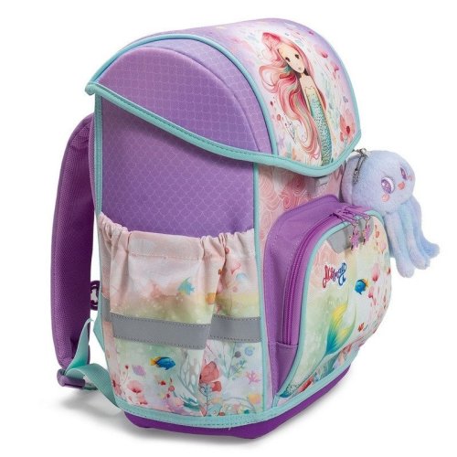 Anatomická školní aktovka MERMAID - mořská panna vyznačující se těmito top vlastnostmi: <br> • 3D ergonomický design zádového dílu aktovky pro správné rozložení hmotnosti s vysoce kvalitní síťovinou s měkkým polstrováním <br> • pevný tvar vyztužený po celé výšce, šířce a hloubce aktovky se zapínáním horní pevné klopy je na magnet s pojistným uzávěrem <br> • nastavitelné, ergonomicky tvarované ramenní popruhy a regulovatelný hrudní popruh s praktickým magnetickým zapínáním <br> • hlavní prostor s další úložnou přihrádkou zpevněný s gumou po bocích pro přizpůsobení se obsahu, vhodný do formátu A4 <br> • zpevněné plastové dno s nožičkami proti oděru <br> • polyesterová textilie nejvyšší kvality a kvalitní zipy <br> • reflexní bezpečnostní prvky vpředu, vzadu a na bocích <br> • rozšiřitelné boční kapsy s pevnou gumičkou po celé šíři kapsy <br> • přední kapsa na svačinu nebo na penál s izolační fólií zevnitř vnější kapsy, oboustranné zapínání na zip - na zipu přívěsek mořské hvězdice <br> • přívěsek na aktovce - plyšová fialovo-modrá chobotnice s kroužkem na klíče a karabinou <br> • rozvrh hodin a jmenovka uvnitř tašky <br> • hmotnost jen 1.250 g <br> • objem 25 litrů