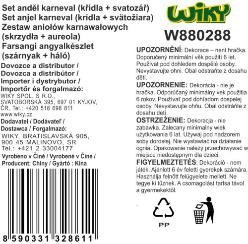 Krásná andělská křídla pro malé andílky. Křídla s peřím pro dokonalý andělský outfit. Sada obsahuje svatozář přichycenou na bílé čelence a křídla na gumičku. Rozměry rozložených křídel: 44 cm (šíře) x 38 cm