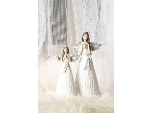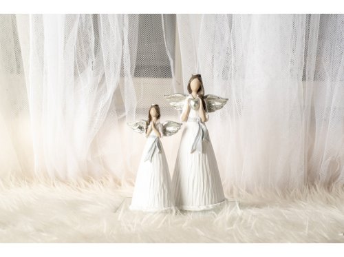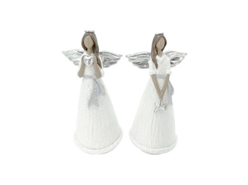 Dekorační andílek z polyresinu o rozměru 85×75×195 mm v kombinaci bílé a stříbrné barvy s jemným glitrem. Jednotlivé varianty jsou dodávány v mixu a mohou se lišit postojem nebo drobnými detaily zpracování.