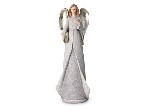 Tento něžný andílek je vyrobený z polyresinu a je zbarvený do béžové barvy se třpytkami. Jeho rozměry jsou 135x368mm, takže je ideální pro umístění na stůl, komodu nebo krbovou římsu. Andílek má jemné rysy a roztomilý výraz, který vnese do vašeho domova radost a optimismus.