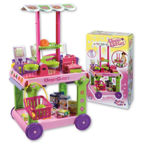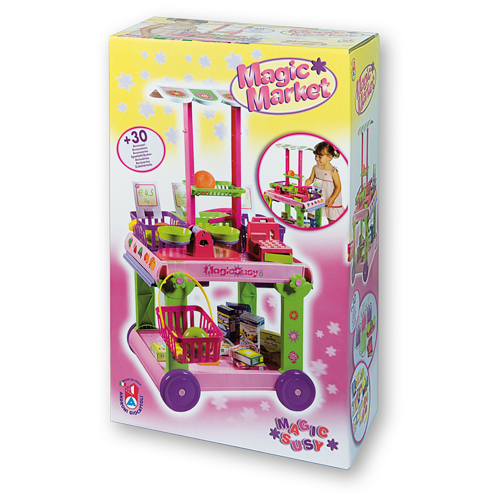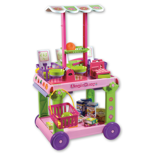 Pojízdná tržnice s bočním výsuvným pultem, vyrobená z kvalitních plastů v Itálii. Obsahuje: pojízdný vozík s odnímatelnou stříškou, 4 košíky s rukojetí, pokladnu s mincemi, váhu s miskami, 12 kusů ovoce a zeleniny a 8 krabiček s potravinovým nebo drogistickým zbožím. Rozměry tržnice se stříškou: 37 x 18 x 85 cm (d x š x v), rozměry tržnice bez stříšky: 37 x 18 x 60 cm (d x š x v), váha 3,57 kg. Doporučený věk od 36 měsíců. Výrobce, italská firma Androni Giocattoli sídlící nedaleko Milána, se specializuje na výrobu plastových hraček na písek a zahradu a také stavebnic UNICO Plus již od roku 1974. Jejím mottem je heslo: Androni Toys: Kvalita vyrobená v Itálii. Používané plasty jsou pevné, ale zároveň pružné a při běžném hraní nedochází k jejich praskání. Vydrží i větší zátěž a proto jsou výrobky vhodné i do školek, kde téměř denně procházejí zatěžkávací zkouškou.