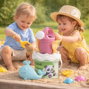 6dílná sada na písek, vyrobená z kvalitních recyklovaných plastů v pastelových barvách v Itálii. Obsahuje: Kyblík, konvičku 0,5 l, sítko, lopatku, hrabičky a tvořítko ve tvaru mořského živočicha. Kyblík: průměr 13 cm, výška 11 cm. Sada: výška 27,5 cm, váha 0,244 kg. Doporučený věk od 10 měsíců.