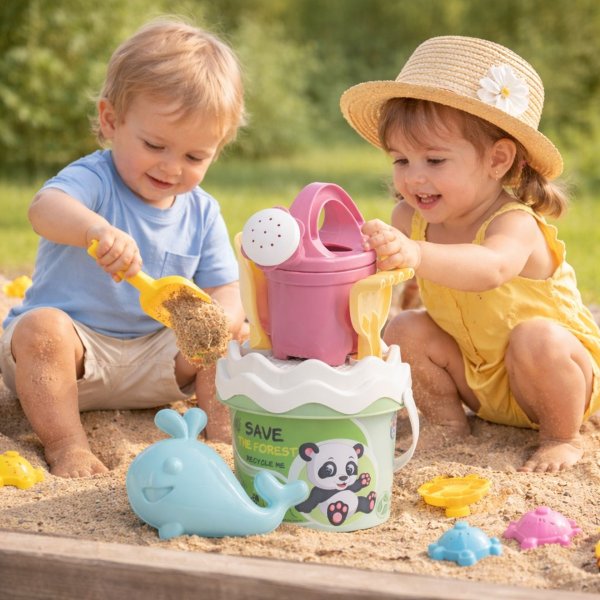 6dílná sada na písek, vyrobená z kvalitních recyklovaných plastů v pastelových barvách v Itálii.