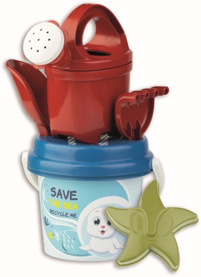 6dílná sada na písek, vyrobená z kvalitních recyklovaných plastů v Itálii. Obsahuje: Kyblík, konvičku 0,5 l, sítko, lopatku, hrabičky a tvořítko ve tvaru mořské hvězdice. Kyblík: průměr 13 cm, výška 11 cm. Sada: výška 29 cm, váha 0,35 kg. Doporučený věk od 12 měsíců.