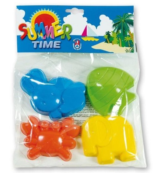 Souprava obsahuje 4 kusy formiček ve tvaru zvířátek (slon, ryba, zajíček a krab).