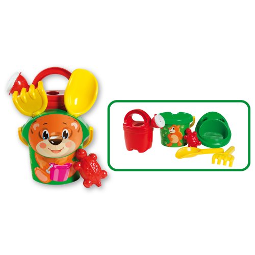 6dílná sada na písek, vyrobená z kvalitních plastů v Itálii. Obsahuje: Kyblík průměr 13 cm, výška 11 cm, konvičku 0,5 l, sítko, lopatku, hrabičky a tvořítko ve tvaru želvičky. Sada: výška 23 cm, váha 0,36 kg. Doporučený věk od 12 měsíců.