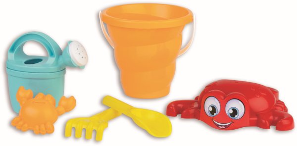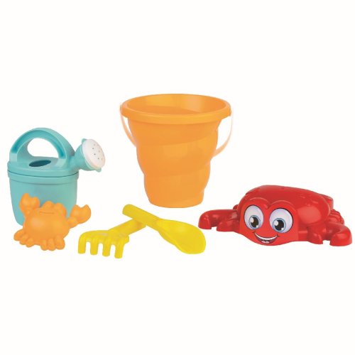 6dílná sada na písek, vyrobená z kvalitních plastů v Itálii. Obsahuje: Kyblík připomínající tvar lastury, sítko s veselým krabem,formičku, konvičku, lopatku a hrabičky. Kyblík: průměr 13 cm. Sada: výška 29 cm, váha 0,33 kg. Doporučený věk od 12 měsíců.