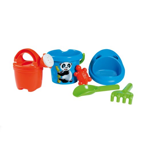 6dílná sada na písek, vyrobená z kvalitních plastů v Itálii. Obsahuje: Kyblík průměr 13 cm, výška 11 cm, konvičku 0,5 l, sítko, lopatku, hrabičky a tvořítko ve tvaru želvičky. Sada: výška 23 cm, váha 0,36 kg. Doporučený věk od 10 měsíců.