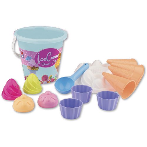 14dílná sada na písek, vyrobená z kvalitních plastů v Itálii. Obsahuje: Kyblík, sítko v podobě zmrzlinového poháru, kopečkovač na zmrzlinu, 4 čepičky zmrzlin, 4 zmrzlinové kornouty a 3 misky. Kyblík: průměr 17 cm, výška 16 cm. Sada: výška 31 cm, váha 0,47 kg. Doporučený věk od 12 měsíců.