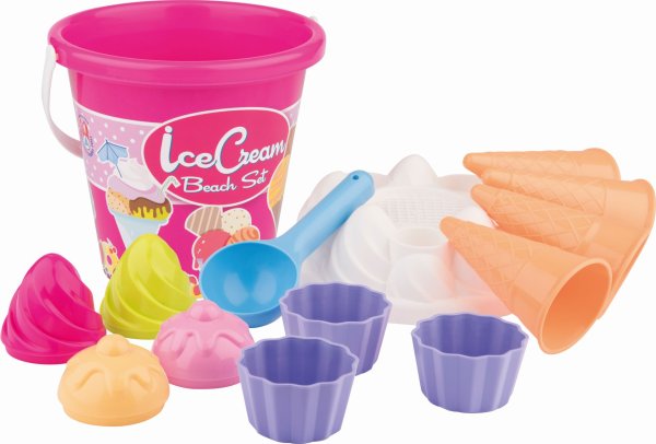 14dílná sada na písek, vyrobená z kvalitních plastů v Itálii. Obsahuje: Kyblík, sítko v podobě zmrzlinového poháru, kopečkovač na zmrzlinu, 4 čepičky zmrzlin, 4 zmrzlinové kornouty a 3 misky. Kyblík: průměr 17 cm, výška 16 cm. Sada: výška 31 cm, váha 0,47 kg. Doporučený věk od 12 měsíců.