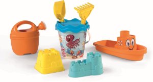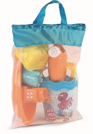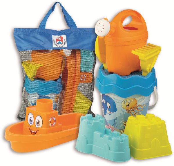 9dílná sada na písek, vyrobená z kvalitních plastů v Itálii. Obsahuje: Kyblík o průměru 17 cm, sítko, konvičku 0,5 l, lopatku a hrabičky, dvě tvořítka hradů a loďku. Vše je uložené v praktické cestovní síťované tašce. Rozměry balení: 34 x 18 x 44 cm ( s x š x v). Váha sady: 0,78 kg. Doporučený věk od 12 měsíců.