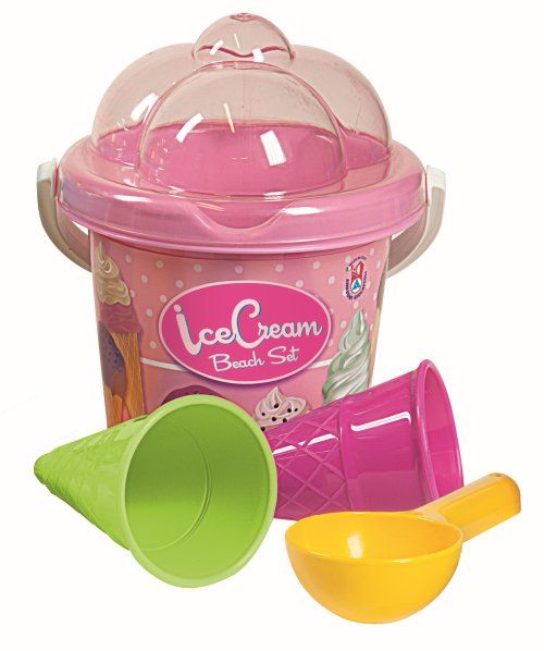 5dílná sada na písek, vyrobená z kvalitních plastů v Itálii. Obsahuje: Kyblík s víkem ve tvaru zmrzlinového poháru, kopečkovač na zmrzlinu a 2 zmrzlinové kornoutky. Kyblík: průměr 13 cm, výška 11 cm. Sada: výška 16 cm, váha 0,26 kg. Doporučený věk od 10 měsíců.
