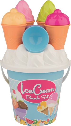 Souprava obsahuje: kyblík s víčkem, naběračku a formičky (11 ks) ve tvaru zmrzlinových kornoutů a kopečků.