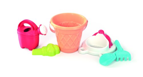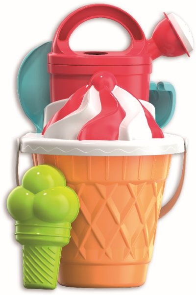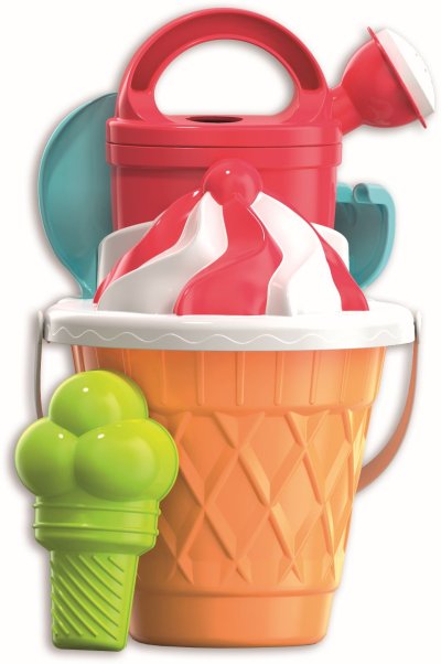 6dílná sada na písek, vyrobená z kvalitních plastů v Itálii. Obsahuje: Kyblík ve stylu kornoutu, sítko v podobě točené zmrzliny, tvořítko ve tvaru zmrzliny se 3 kopečky, konvičku, lopatku a hrabičky. Kyblík: průměr 17 cm, výška 16 cm. Sada: výška 30 cm, váha 0,42 kg. Doporučený věk od 12 měsíců.